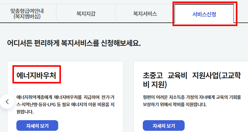 - 복지로 사이트 접속 → 로그인 후 ‘에너지바우처 신청’