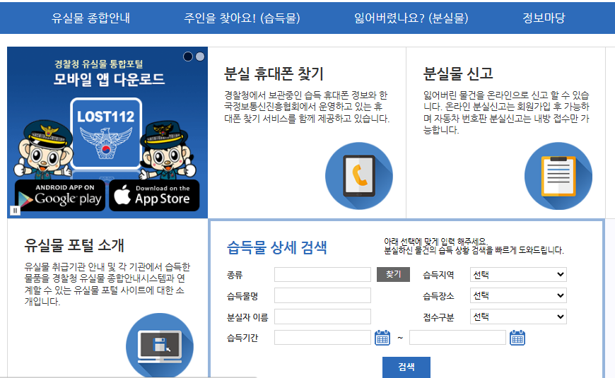 - 인터넷 검색창에 ‘로스트112’ 또는 ‘분실물 찾기 경찰청’ 입력 후 접속 가능
