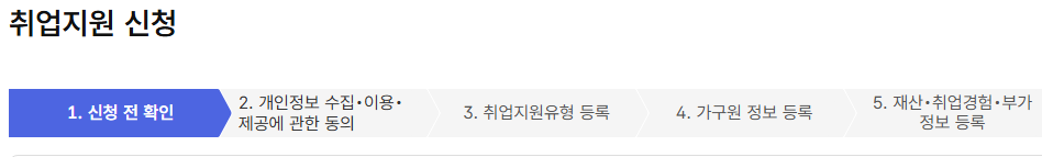 1단계: 온라인 신청 → 2단계: 자격 심사 → 3단계: 초기상담 및 계획 수립 → 4단계: 본격 서비스 이용(6~12개월) → 5단계: 취업 성공 및 사후관리
