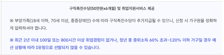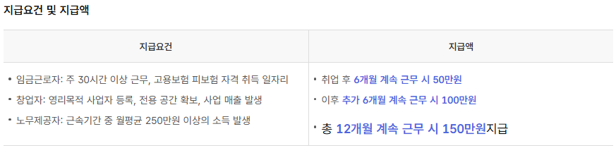 - 취업 성공 후 6개월 유지하면 50만 원, 12개월 유지하면 100만 원 추가로 지급