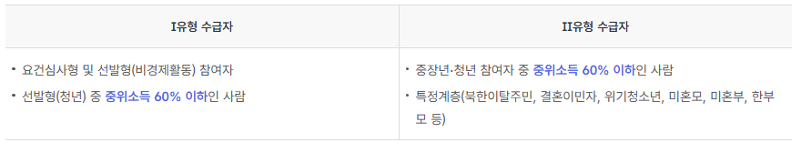 | 지원 대상 | 저소득층, 청년 | 청년, 중장년, 특정계층 |