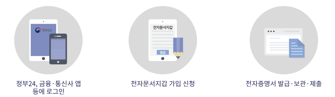 정부24 또는 인증 연동 앱에서 전자문서지갑을 생성하고 본인 인증을 완료합니다. 공공 문서를 안전하게 스마트폰에 저장할 수 있습니다.