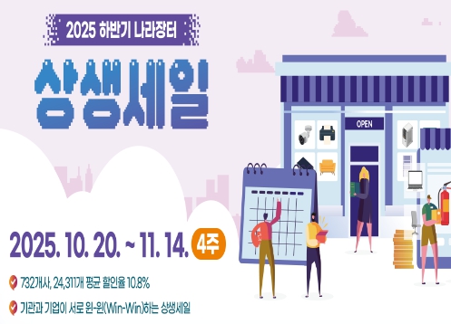 조달청은 공공조달 시장의 활력을 높이고 중소기업의 매출 증진을 돕기 위해 ‘2025년 하반기 나라장터 상생세일’을 10월 20일부터 11월 14일까지 4주간 진행합니다. 공공기관은 합리적인 가격으로 필요한 물품을 구입하고, 조달기업은 판로를 넓힐 수 있는 상생형 행사입니다.
