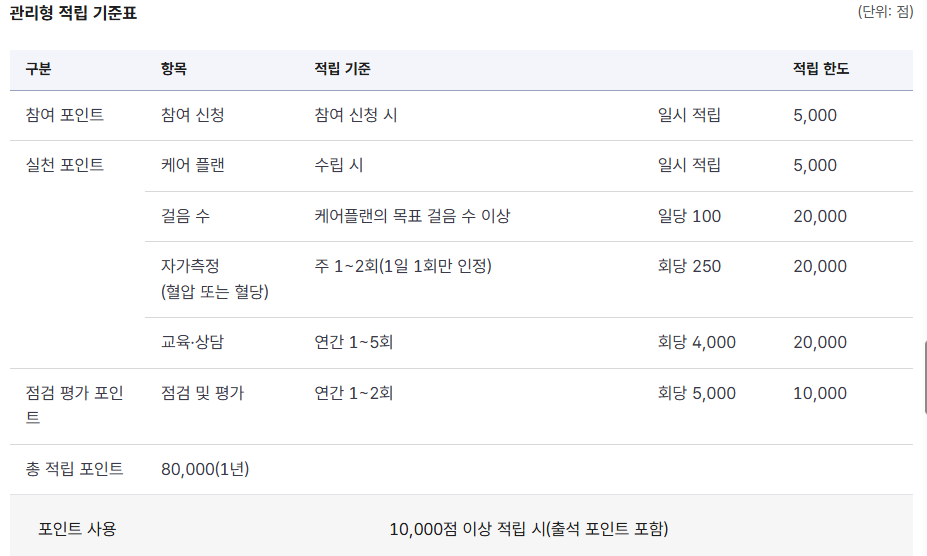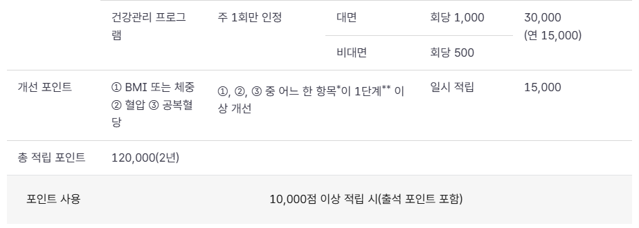 - 건강관리 프로그램 참여: 회당 최대 1,000점 (연 15,000점 한도)