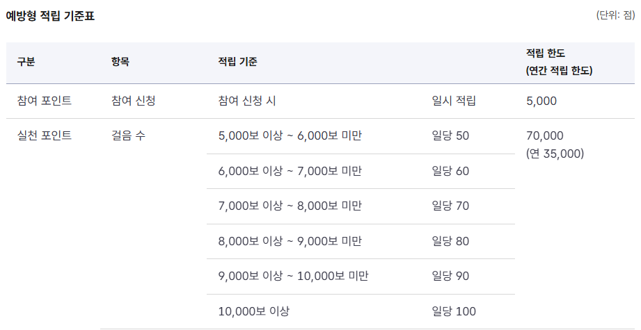 - 걷기 실천: 1일 5,000보 달성 시 100점 (연 35,000점 한도)