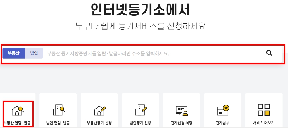 - 상단 메뉴에서 ‘부동산 등기 열람/발급’ 클릭