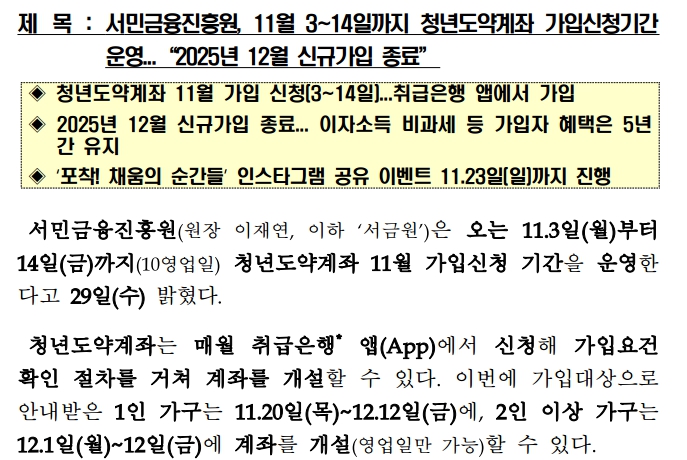 청년층의 자산 형성을 돕는 대표 금융정책상품인 ‘청년도약계좌’가 11월에도 신규 가입 기회를 엽니다. 서민금융진흥원(서금원)은 3일부터 14일까지 10영업일 동안 청년도약계좌 11월 가입 신청 기간을 운영한다고 밝혔습니다. 특히 이번 모집은 연내 마지막 정기 신청 전 마지막 기회로, 관심 있는 청년이라면 놓치지 말아야 합니다.