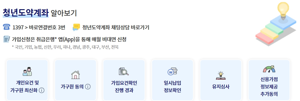 자세한 상품 정보는 청년도약계좌 공식 홈페이지 에서 확인할 수 있습니다. 또한 문의사항은 서민금융콜센터(1397 → ‘3’번) 또는 각 취급은행 고객센터를 통해 상담받을 수 있습니다.