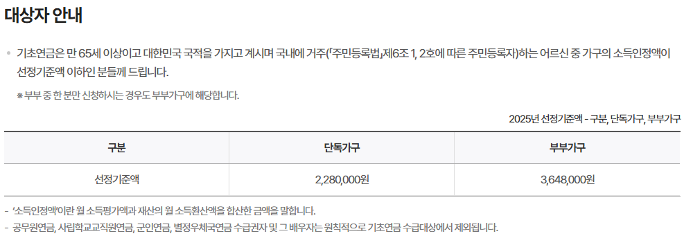 - 소득 기준: 소득인정액이 일정 기준 이하일 것 (단독가구 월 228만 원, 부부가구 월 364만 8천 원 이하)