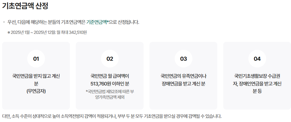 기초연금 수급 대상자는 2025년 기준 최대 월 34만 2,510원을 받을 수 있습니다. 다만 소득이 기준에 근접할수록 감액될 수 있으며, 국민연금을 함께 받는 경우 연금 수령액이 일정 금액 이상이면 일부 조정이 이루어집니다.