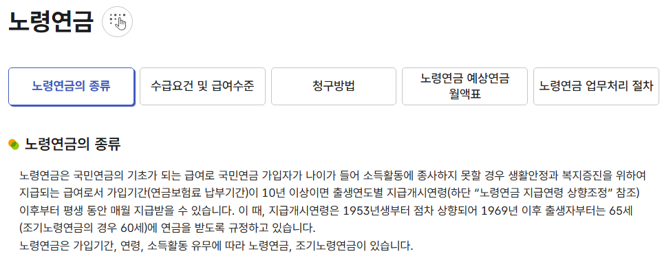 - 노령연금: 국민연금 가입 10년 이상, 만 63세 이상