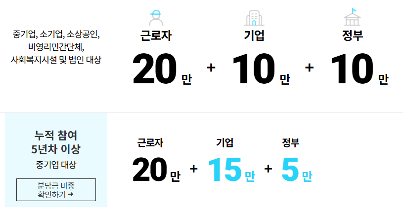 누적 5년차 중기업의 경우, 기업 분담금이 기존 10만 원에서 15만 원으로 상향 조정됩니다. 또한 지난해 큰 호응을 얻은 ‘동반성장 지원제도’를 통해 대기업의 자발적 참여를 유도함으로써 중소기업 근로자들에게 더 많은 기회를 제공할 예정입니다.