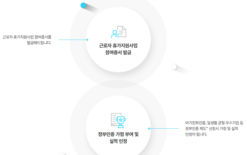 근로자 복지 향상에 적극적으로 참여한 기업에는 ‘참여증서’가 발급되며, 여가친화인증(문화체육관광부)이나 일·생활 균형 우수기업(고용노동부) 등 정부 인증 평가 시 가점을 받을 수 있습니다. 또한 우수 참여기업으로 선정될 경우 정부 포상과 더불어 우수사례집 수록 및 홍보 기회도 제공됩니다.