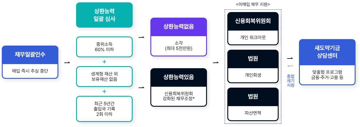 - 상환능력 있음: 강화된 채무조정 적용(원금 30~80% 감면, 최장 10년 분할상환)