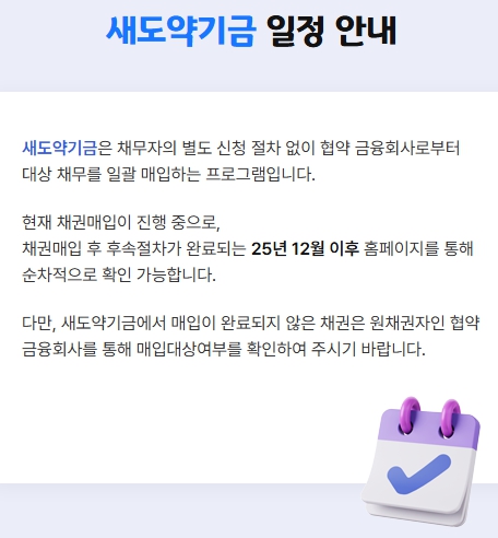 - 모든 연체채권이 즉시 매입되는 것은 아니므로, 매입 여부가 확인되지 않을 경우 원채권자 금융회사에 문의하시기 바랍니다.