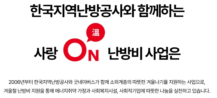‘사랑ON(溫)’은 2006년부터 꾸준히 이어져 온 에너지 복지사업으로, 사회적 약자와 복지시설에 난방비를 지원해 겨울철 난방비 부담을 덜어주는 따뜻한 프로젝트입니다. 한국지역난방공사와 굿네이버스가 협력하여, 경제적으로 어려움을 겪는 개인과 기관이 보다 안정적으로 겨울을 보낼 수 있도록 돕는 것을 목표로 하고 있습니다.