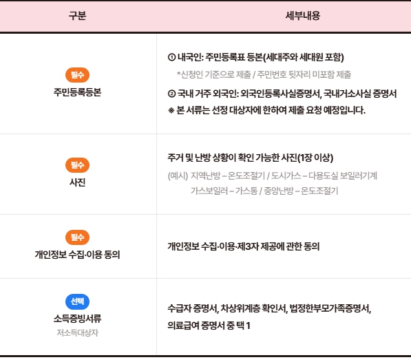 겨울철 난방비 부담이 큰 가정이라면 누구나 지원을 신청할 수 있습니다. 단, 지난해 해당 사업의 수혜자로 선정된 경우에는 올해 재신청이 제한됩니다. 내국인은 주민등록등본을 기준으로, 외국인은 국내 체류 사실을 확인할 수 있는 증빙서류를 제출해야 합니다.