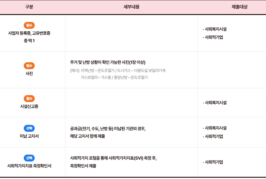 난방비 지출로 어려움을 겪는 사회복지시설과 사회적기업도 지원 대상에 포함됩니다. 단, 비인가 복지시설과 예비 사회적기업은 지원이 제한되며, 작년 수혜 기관 역시 중복신청이 불가합니다.