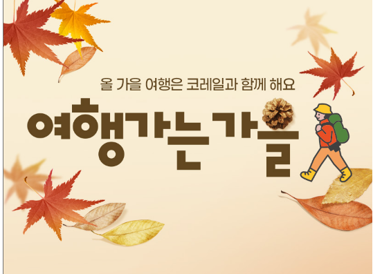 붉게 물든 산과 황금빛 들판이 어우러지는 계절, 가을. 코레일의 ‘여행가는 가을’ 프로모션으로 여유롭고 실속 있는 철도여행을 떠나보세요. 단풍, 축제, 그리고 설레는 여정이 여러분을 기다리고 있습니다.