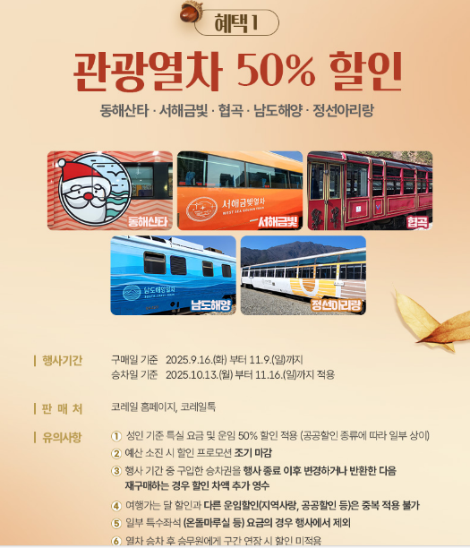 특히 정선아리랑열차와 남도해양열차는 가을의 색채가 가장 짙은 노선으로, 창밖으로 펼쳐지는 단풍과 해안 풍경이 압도적입니다. 이번 기회에만 누릴 수 있는 반값 혜택으로 가을 감성을 더해보세요.