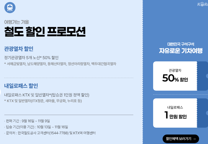 철도 자유이용권 ‘내일로’도 이번 가을 특별할인 혜택을 제공합니다. 모든 이용권 종류에서 1만 원이 즉시 할인되며, 나이 제한 없이 누구나 구매할 수 있습니다.