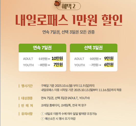 - 유스권(29세 이하): 연속 7일권 7만 원 → 6만 원, 선택 3일권 6만 원 → 5만 원